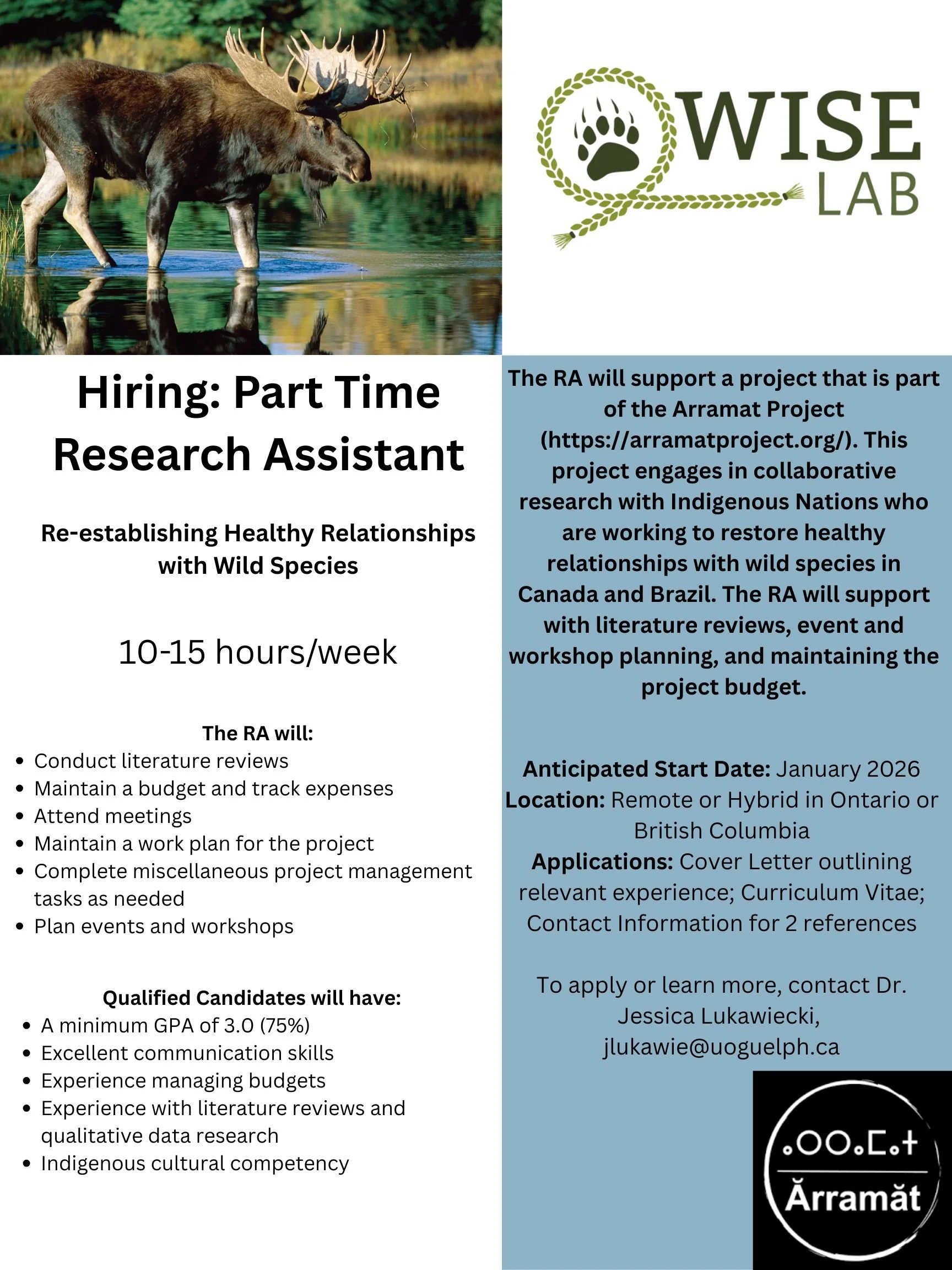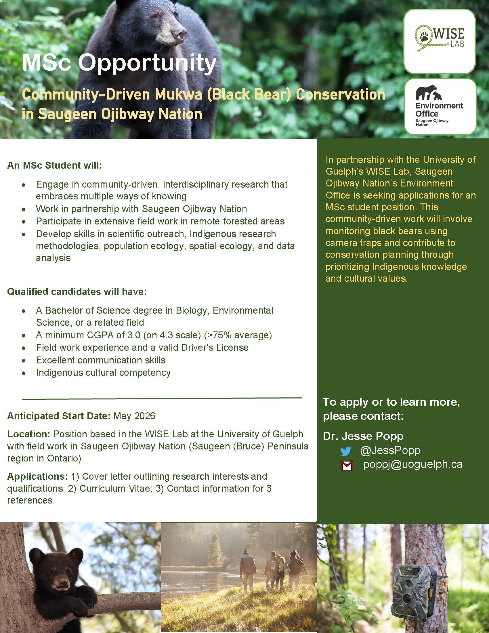 Team members in the WISE Lab gain valuable, highly sought after skills in an environment where exploration and critical thinking are encouraged. Students have the opportunity to acquire a wide variety of experience in areas such as ecological fieldwork, Indigenous research methodologies, and spatial and statistical analyses. WISE Lab members include postdoctoral fellows, graduate students, undergraduate Honours thesis students, and research assistants/associates. Graduate students are enrolled in the University of Guelph’s exceptional M.Sc. or MES programs in Environmental Science, while additional opportunities exist with Dr. Popp in co-supervisory arrangements with other universities. Research opportunities in the WISE Lab are often advertised through this webpage but unsolicited inquiries are encouraged.